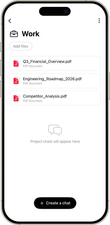 Add PDFs and texts to projects. Chat with your docs, fully on-device.